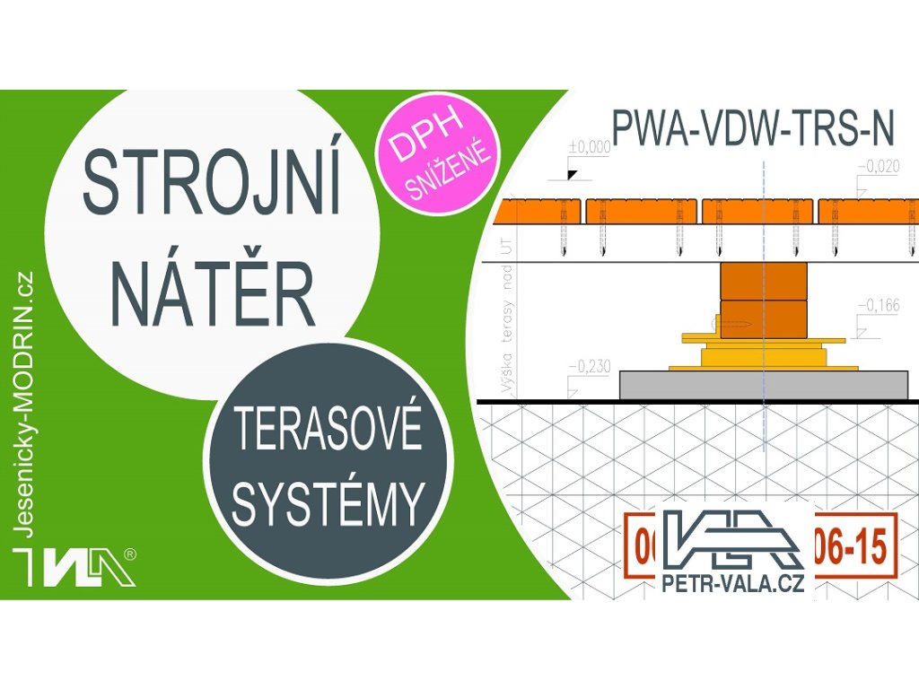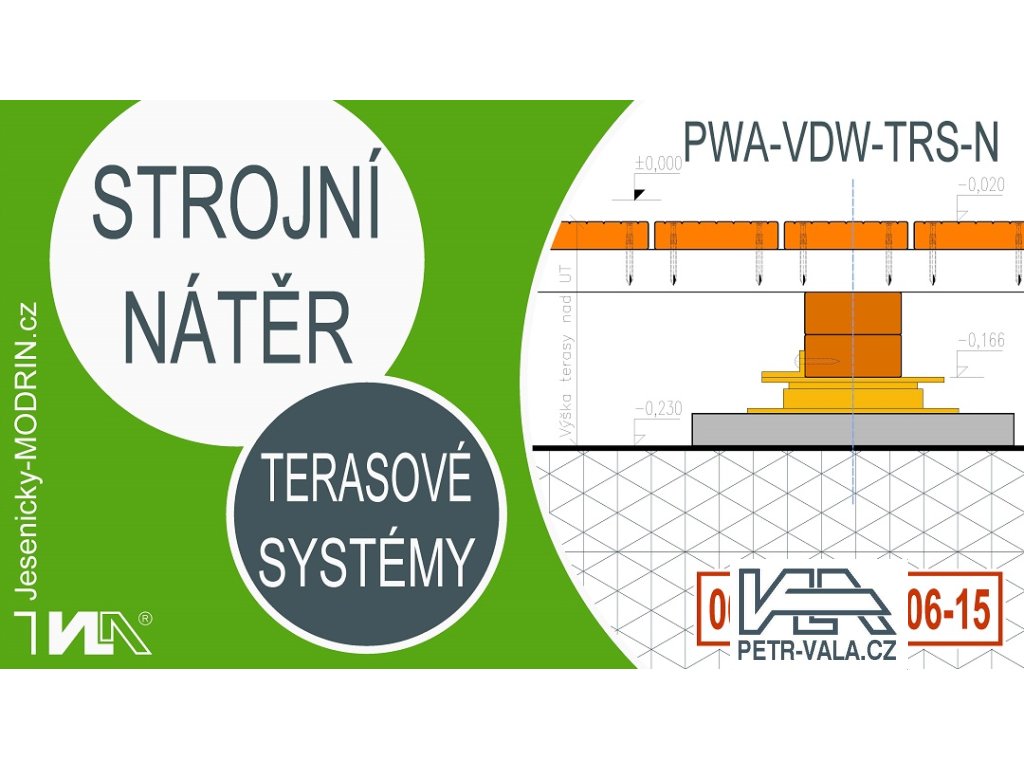 Strojně prováděný nátěr terasového UNI systému PWA-VDW-TRS s dvojitým dřevěným roštem (DDR)